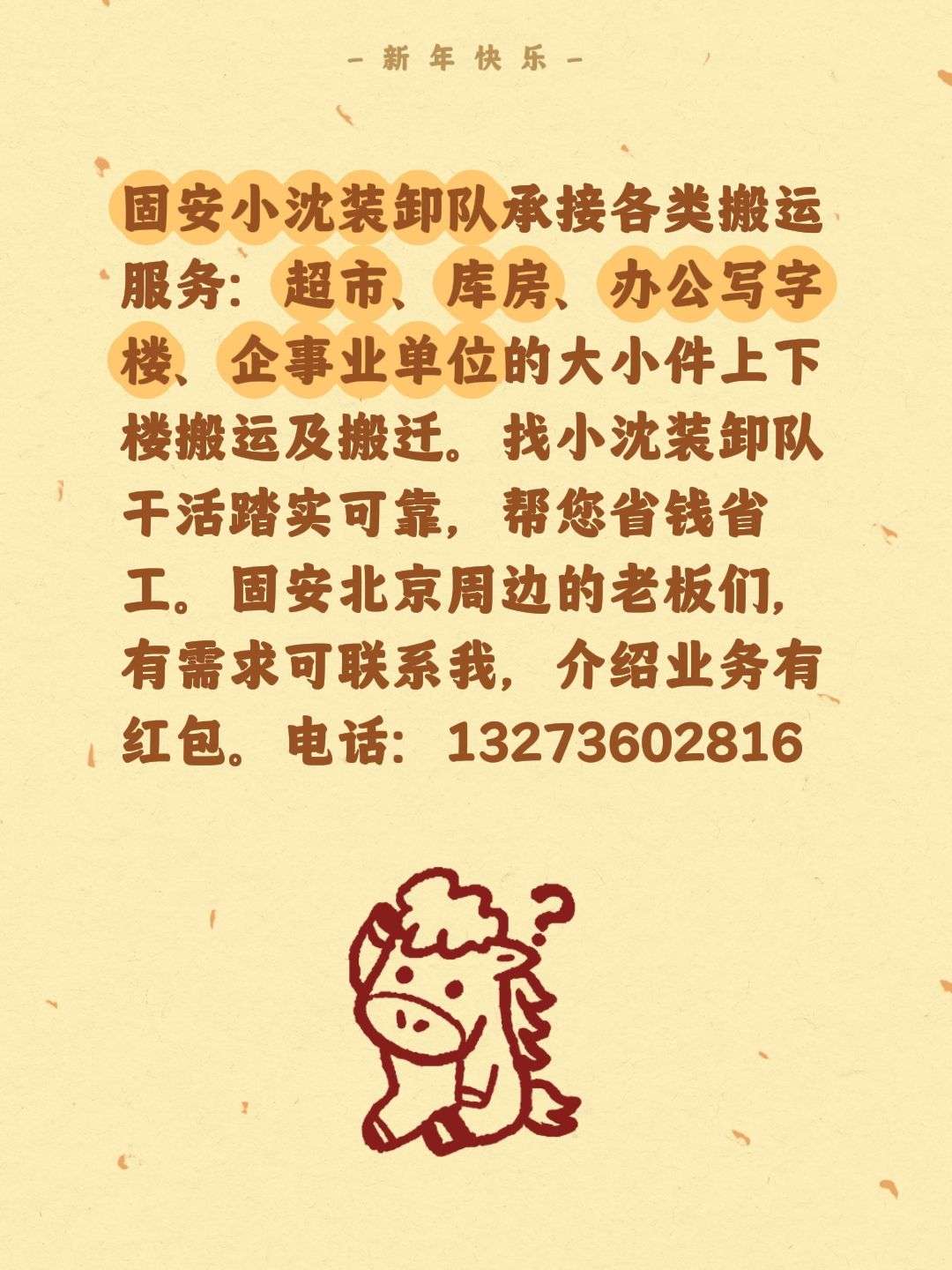 小沈装卸队:小工、瓦工,木工,力工、散工、拆除工、临时工、小时工、搬运东西、装卸工、搬家、人力搬运等各种杂活,搬运装卸车、搬运大冰箱、滚筒洗衣机上下楼、人工装车、搬运瓷砖上下楼、搬运材料上下楼、卸家具、搬运家用电器。13273602816
